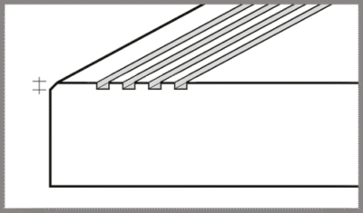 This is obtained by pouring a mixture of coloured resin and carborundum into a milled slot 10 x 5 mm. The result is a very high performance non-slip strip which does not protrude above the surface of the tread and can be coloured at will, thus acting also as a demarcation line on the stair.